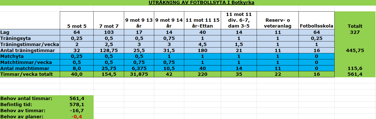 Totalt antal praktiskt möjliga tränings- och matchtillfällen att fördela per fotbollsyta och vecka är: