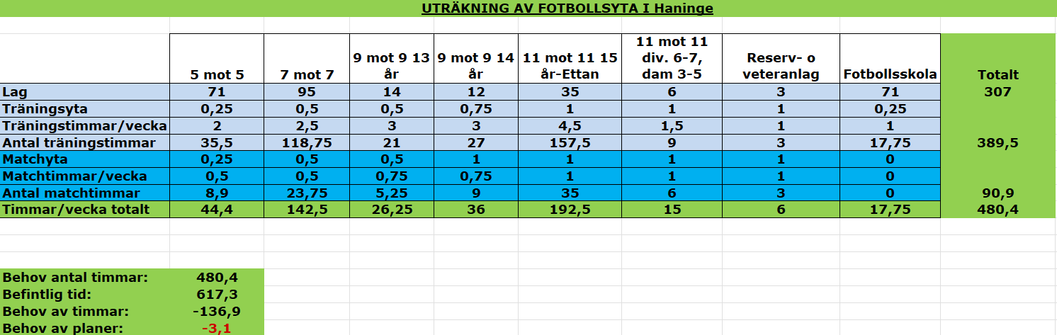 Totalt antal praktiskt möjliga tränings- och matchtillfällen att fördela per fotbollsyta och vecka är: