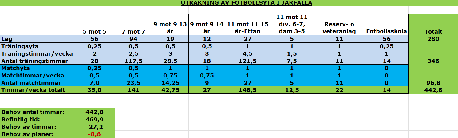 Totalt antal praktiskt möjliga tränings- och matchtillfällen att fördela per fotbollsyta och vecka är: