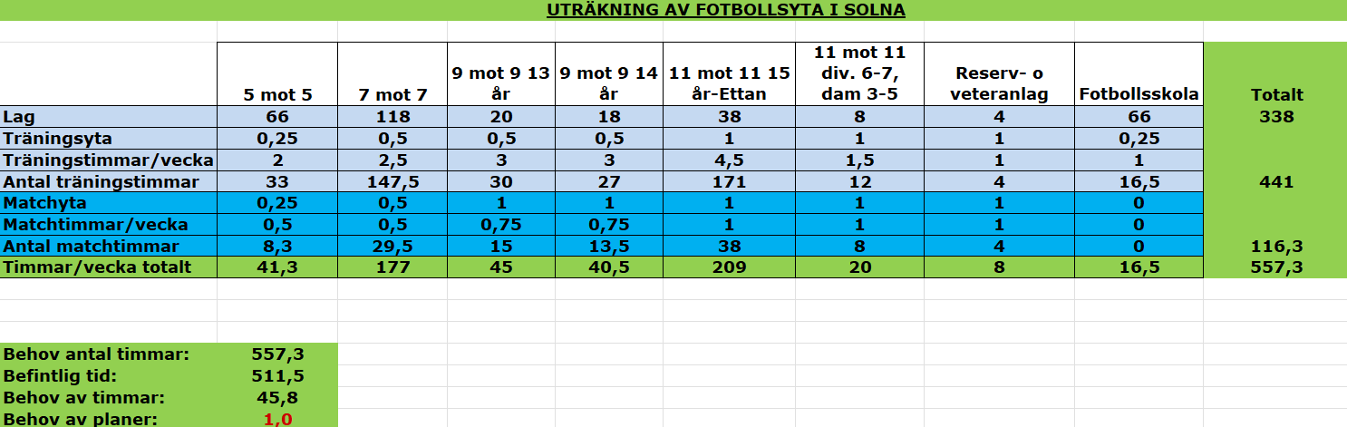Totalt antal praktiskt möjliga tränings- och matchtillfällen att fördela per fotbollsyta och vecka är: