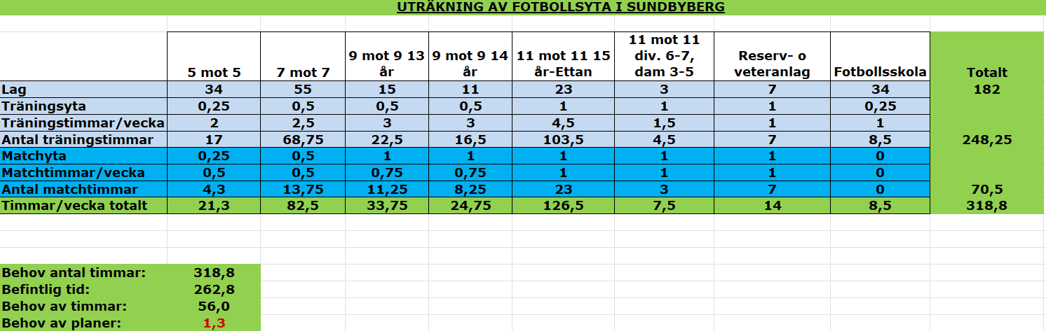 Totalt antal praktiskt möjliga tränings- och matchtillfällen att fördela per fotbollsyta och vecka är: