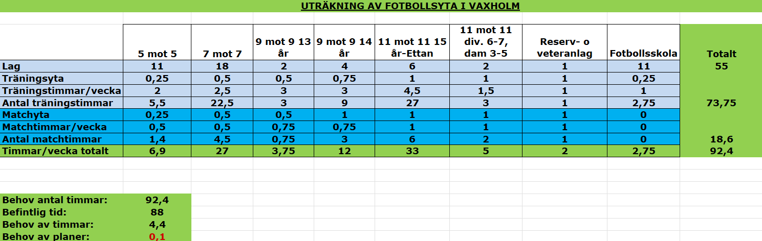 Totalt antal praktiskt möjliga tränings- och matchtillfällen att fördela per fotbollsyta och vecka är: